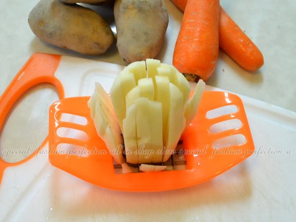 ?將適當大小的馬鈴薯削皮後, 使用切薯器下壓,一條條均勻的薯條就切出來囉